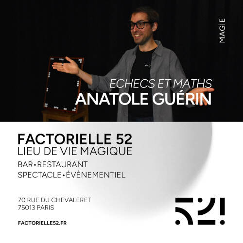 Afficher le planLe temps d’une soirée, Anatole relève le défi de vous bluffer, vous faire rire et rêver avec… les mathématiques ! Derrière les murs des collèges et des lycées, une équation reste sans solution : celle de l’échec en mathématiques. Pour percer ce mystère, notre journaliste d’investigation Anatole G. s’est infiltré au sein de l’éducation nationale sous le nom de M. Carrez, remplaçant urgentiste en mathématiques. Si cette matière lui est complètement étrangère, il espère tout de même s’en sortir avec quelques tours de magie en poche. Mais cela sera-t-il suffisant pour maintenir l’illusion ? Depuis plus de 10 ans, Anatole se produit sur scène et en close-up pour le plus grand plaisir de ses spectateurs. Ces deux terrains de jeux lui ont permis de développer une magie interactive et originale. Côté mathématiques, on vous laissera décider de son niveau d’expertise … professeur ou imposteur ? De 7 à 52!* ans. *52! = 52x51x50x….x2x1.