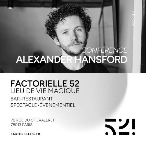Afficher le planAlex Hansford au Factorielle 52 ! Nous avons le plaisir d’accueillir Alex Hansford, magicien anglais de renommée internationale, pour une conférence pour magiciens ! 📅 Le 1er mai 📍 Factorielle 52 Une occasion rare de plonger dans les secrets d’un grand cartomane. ⚠️ La conférence se déroulera en anglais. Ne manquez pas cet événement magique !